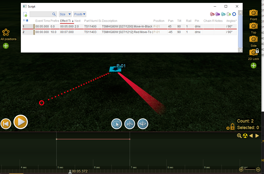 Getting the beam to aim 45R in the ground plane requires both “pan” and “tilt”. Tilt in Finale is the right handed rotation around the X-axis that points to the right from the viewer’s point of view. So tilting the beam 90 degrees aims it straight at the viewer’s face, which is where it is supposed to be in the middle of this pan-sweep from right to left.