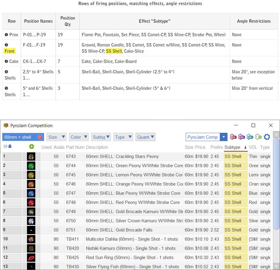Yes, the 60mm shells can be fired from the “Front” positions (F-01…F-19). Whenever there is doubt, the effect “Subtype” is the best way to tell which position an effect can be fired from. As you can see in the screenshot below, the Subtype for the 60mm shells is “SS Shell”. By referencing the position layout chart on the competition page, you can see that this Subtype can be fired from “Front” row of positions.