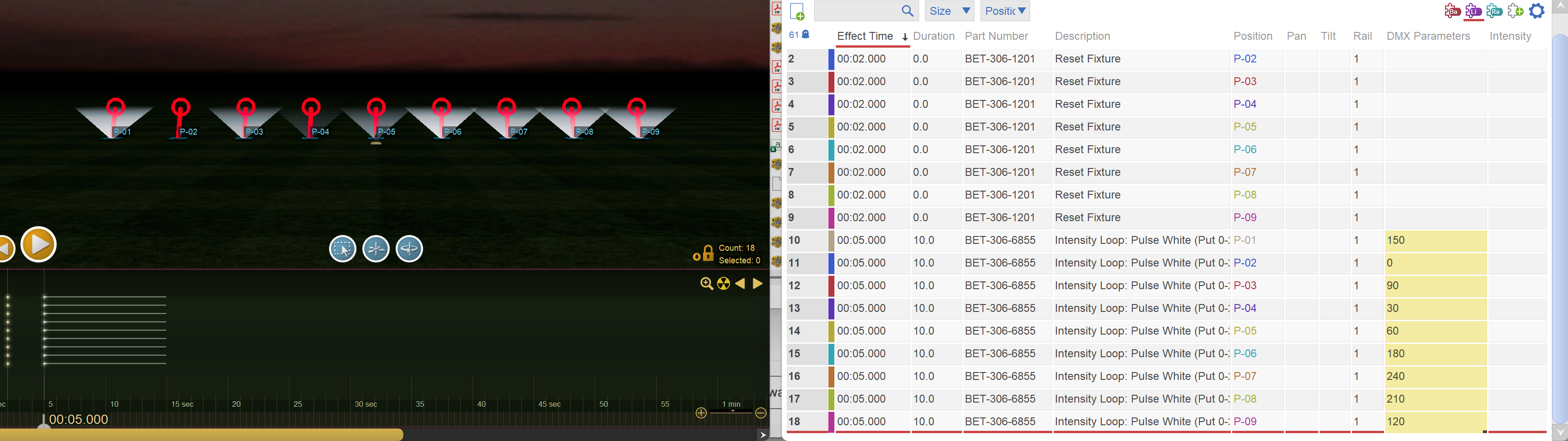 NewcomerIn the flurry to get the latest releases out, which hit simultaneously with PyroJam, PTC, and Elevate, our documentation and communication about what the releases actually contain has been lacking. There are two new columns in the script window, DMX Parameters and Intensity, which create variations of individual effects in the script. Why care? Because with these per-event changes you can make cool scenes and you don’t have to create custom effects to do it. Here’s an example for a row of par lights that looks awesome at the beginning of a show: